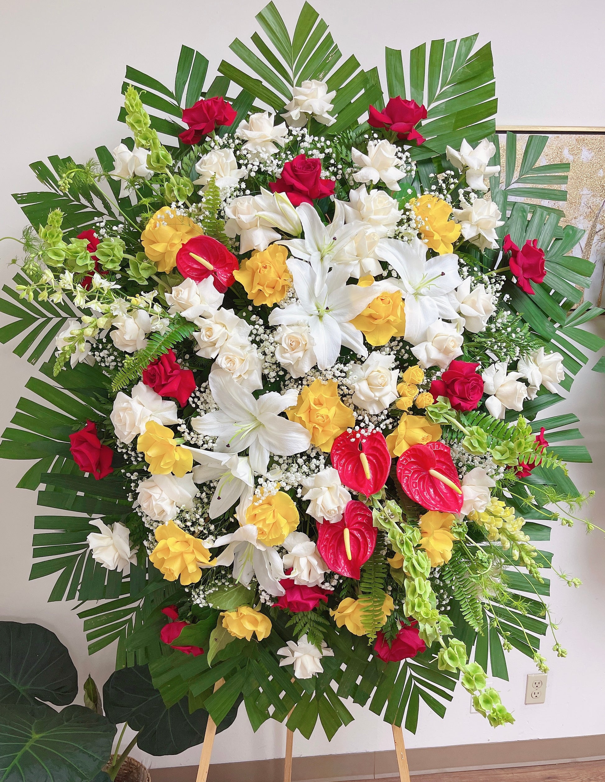 - One-sided standing spray arrangement with roses (Color of roses will be change to customer's choice) , white lilies, white baby's breath, white carnation and assorted greenery