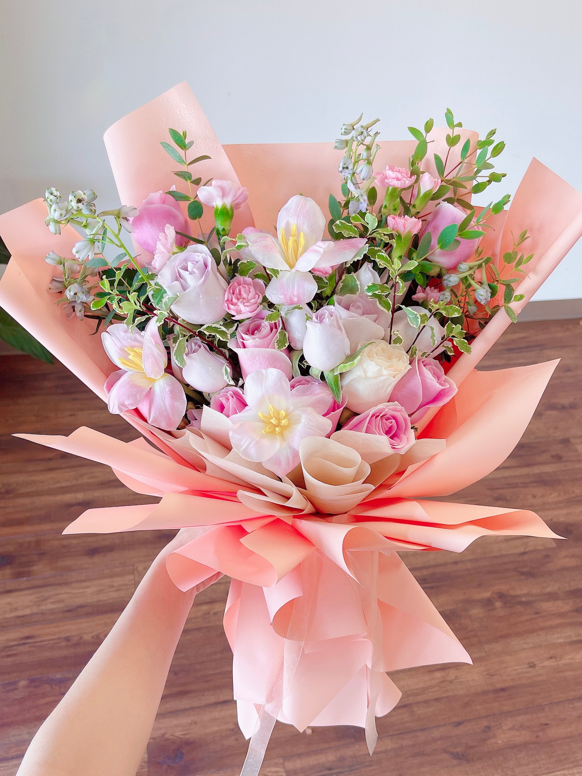 - Fresh flowers gift-wrap bouquet. Waterproof wrapping finish, no glass container