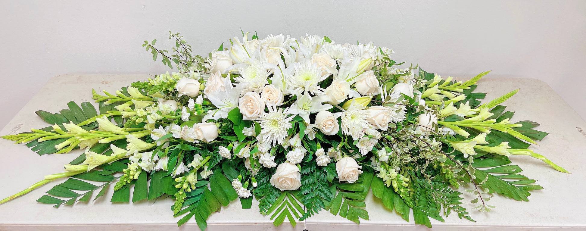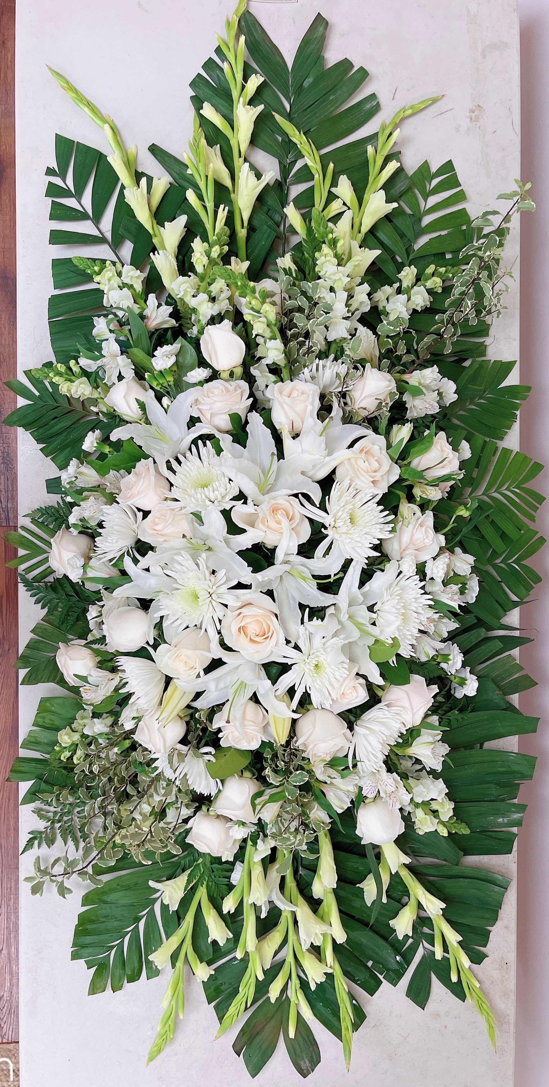 - All around full size casket flower arrangement ( this is a 5.5 to 6 feet long arrangement, so do not order if intended for half open casket)
