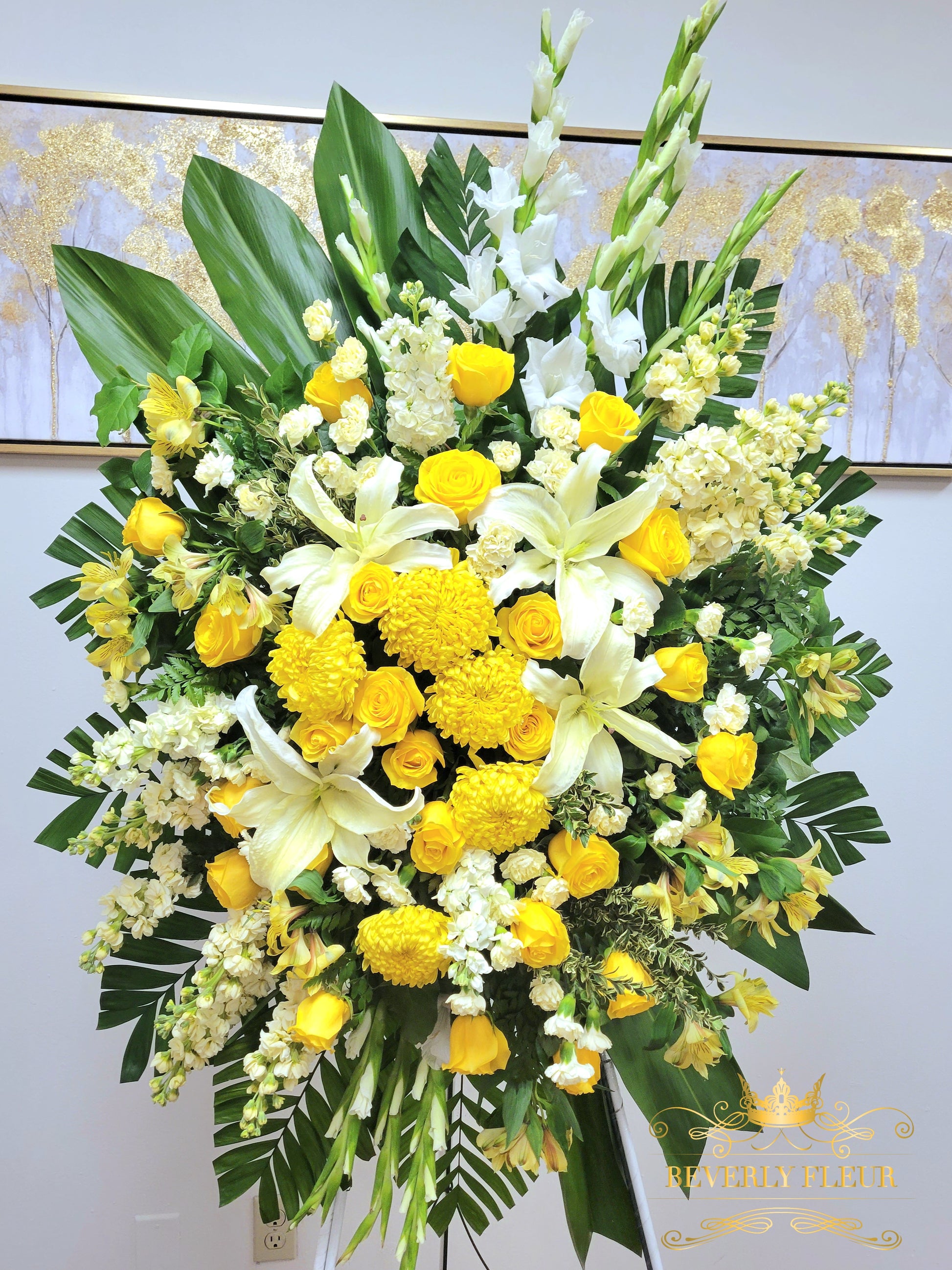 Celebrate a beautiful life with a truly heartfelt gesture. Our elegant standing sympathy spray is arranged with roses, lilies, China-mum, orchid, snap dragon and carnation. A traditional floral display for the services, it’s a touching way to honor the memory of a loved one while expressing your deepest condolences.