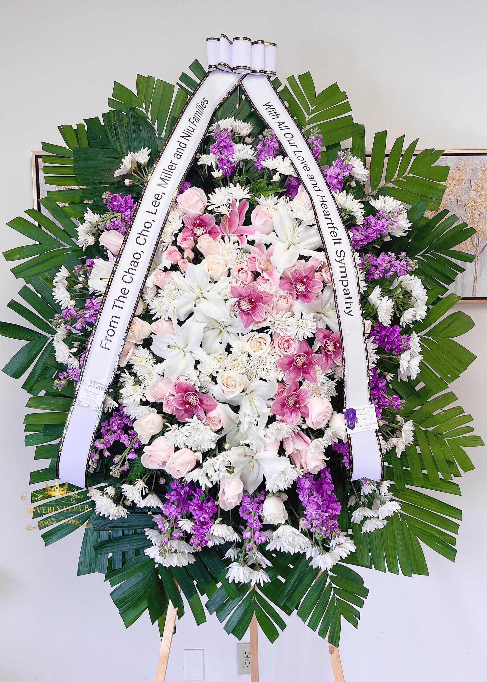Celebrate a beautiful life with a truly heartfelt gesture. Our elegant standing sympathy spray is arranged with roses, lilies, China-mum, orchid, snap dragon and carnation. A traditional floral display for the services, it’s a touching way to honor the memory of a loved one while expressing your deepest condolences.