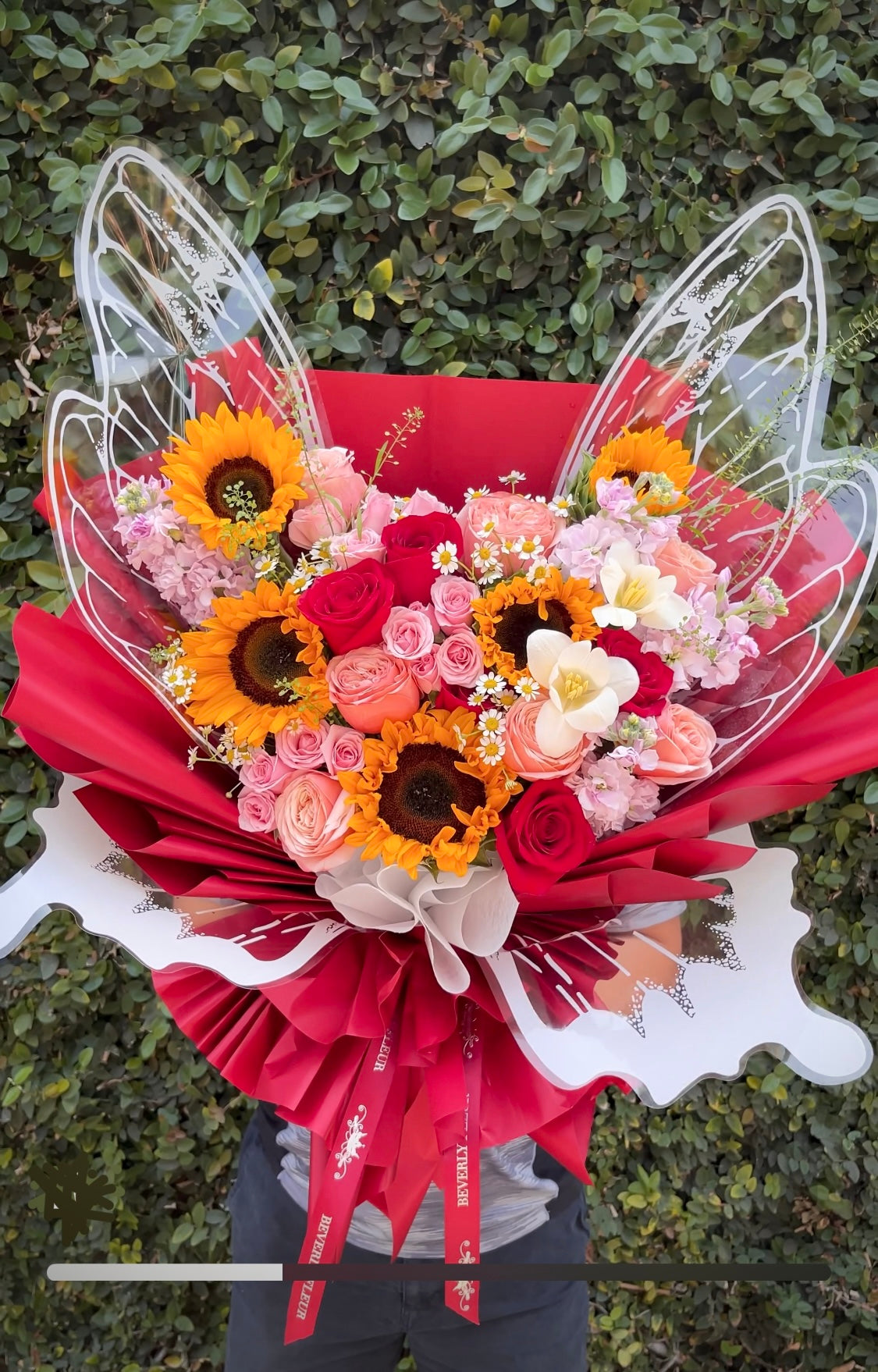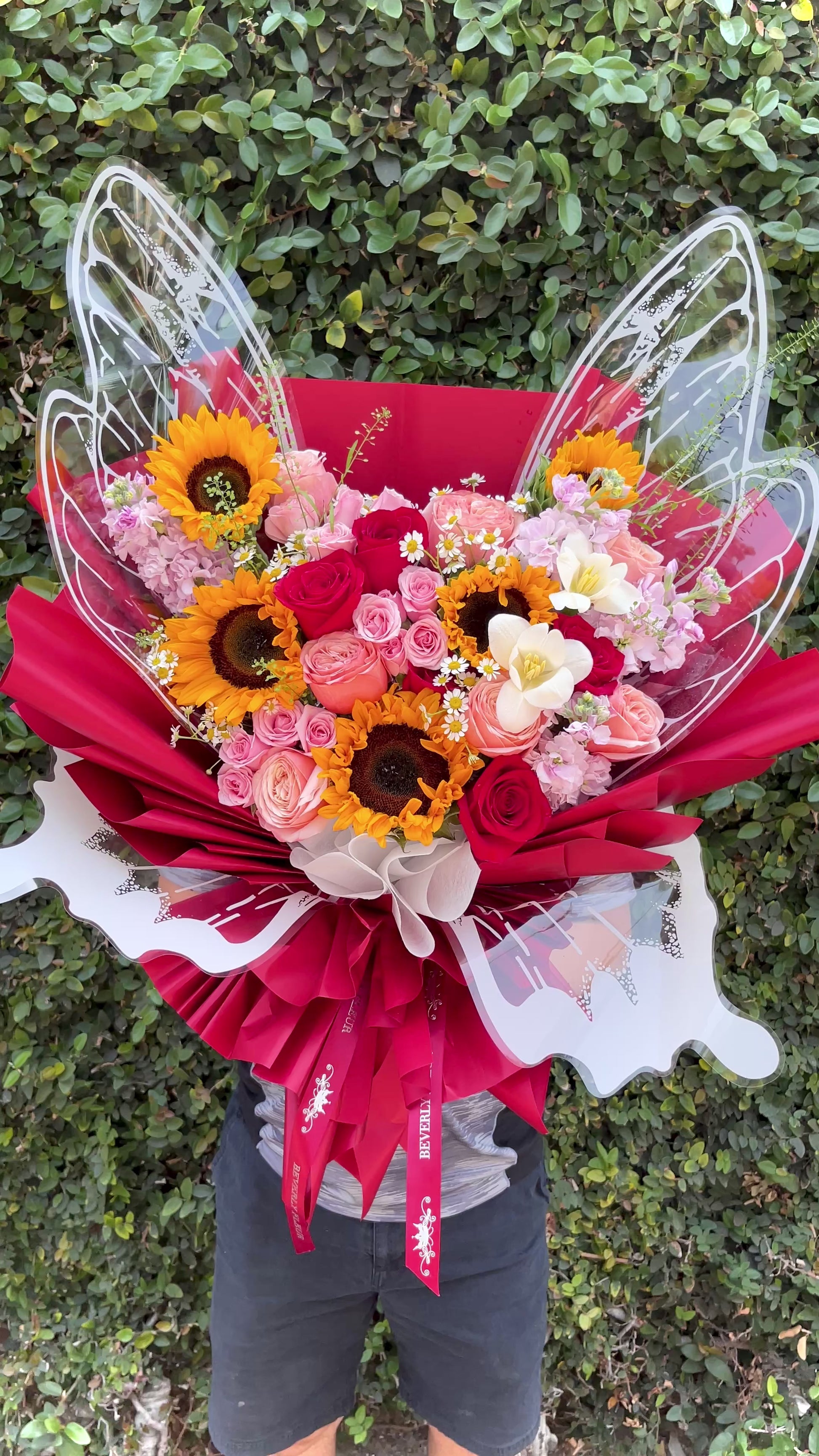 - Fresh flowers gift-wrap bouquet. Paper wrapping finish. This bouquet has its own Water Source no need for extra container .