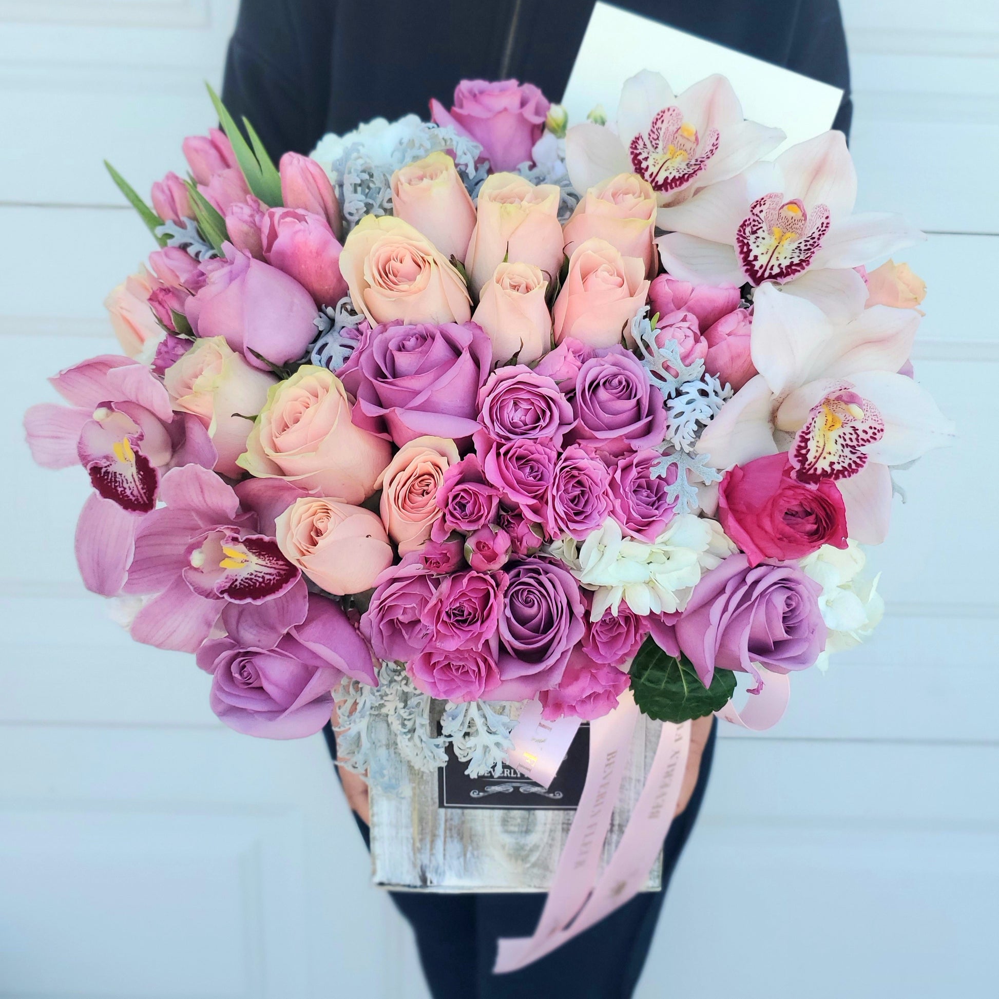 These fresh flowers are arranged in a woodenbox. Send this arrangement to your loved ones and they'll be transfixed by this dazzling display of blooms.
