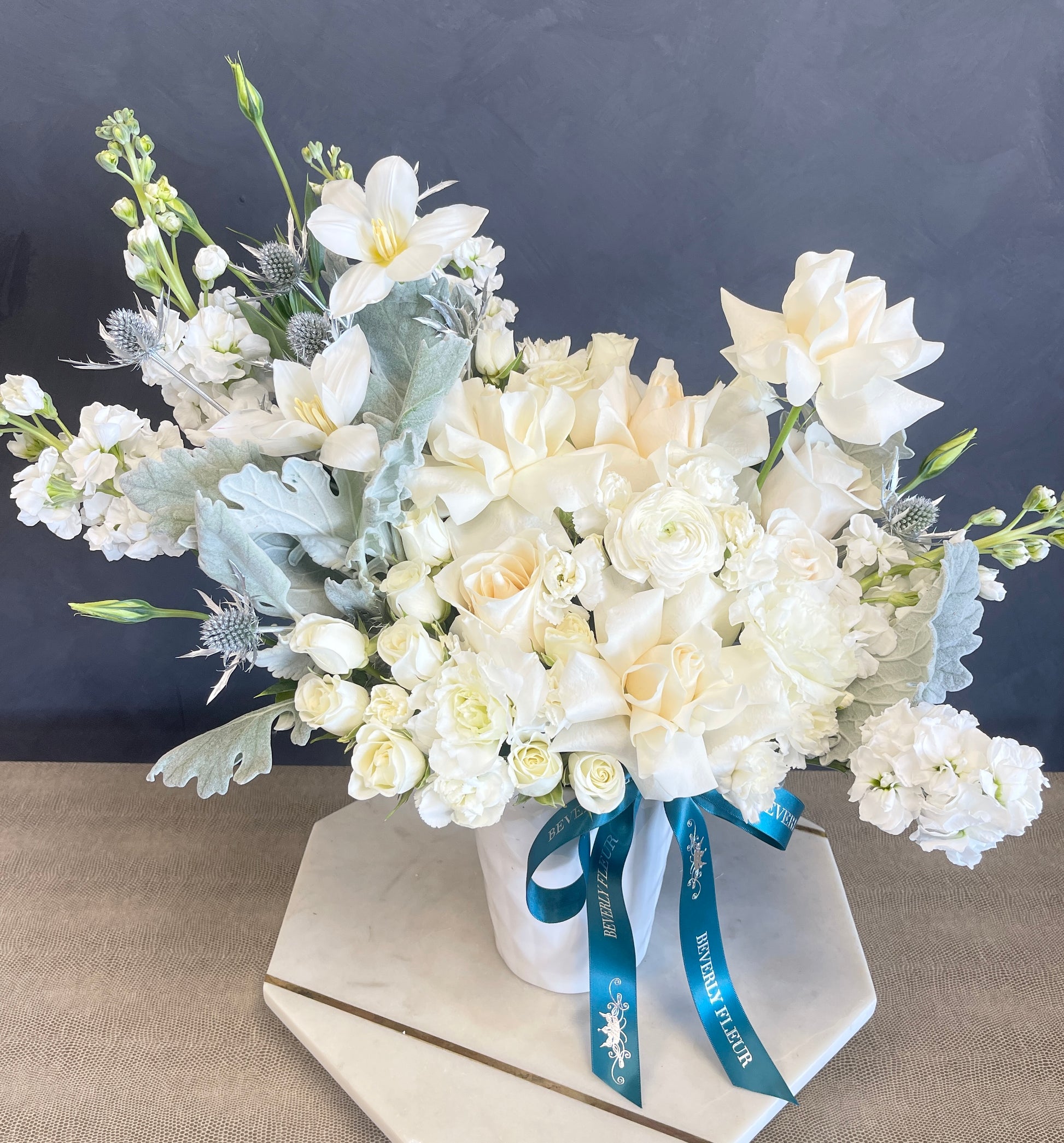 Although the actual flower arrangements may not precisely match the picture, its overall essence will. Occasionally, substitutions of flowers or containers happen due to weather, seasonality and market conditions which may affect availability. In this case, we will ensure that the style, theme and color scheme of your arrangement is preserved and will only substitute flowers of equal or higher value.