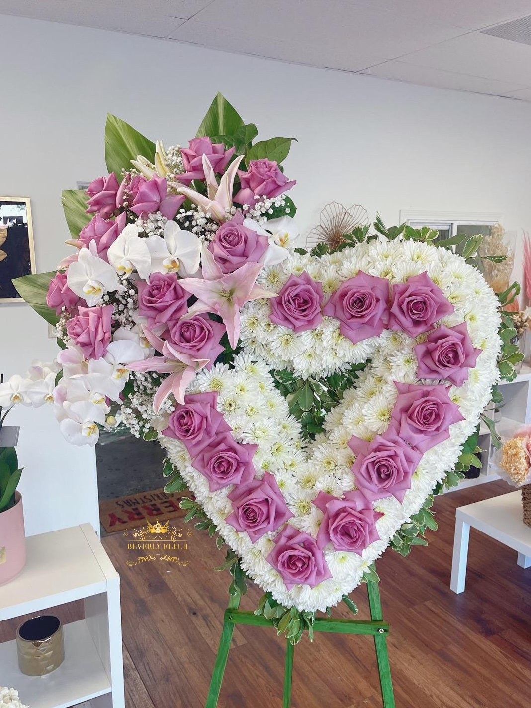 Celebrate a beautiful life with a truly heartfelt gesture. Our elegant heart wreath is arranged with a gathering of roses, lilies, baby's breath and cushion pom-poms. A beautiful floral display for the services, it’s a touching way to honor the memory of a loved one while expressing your deepest condolences.