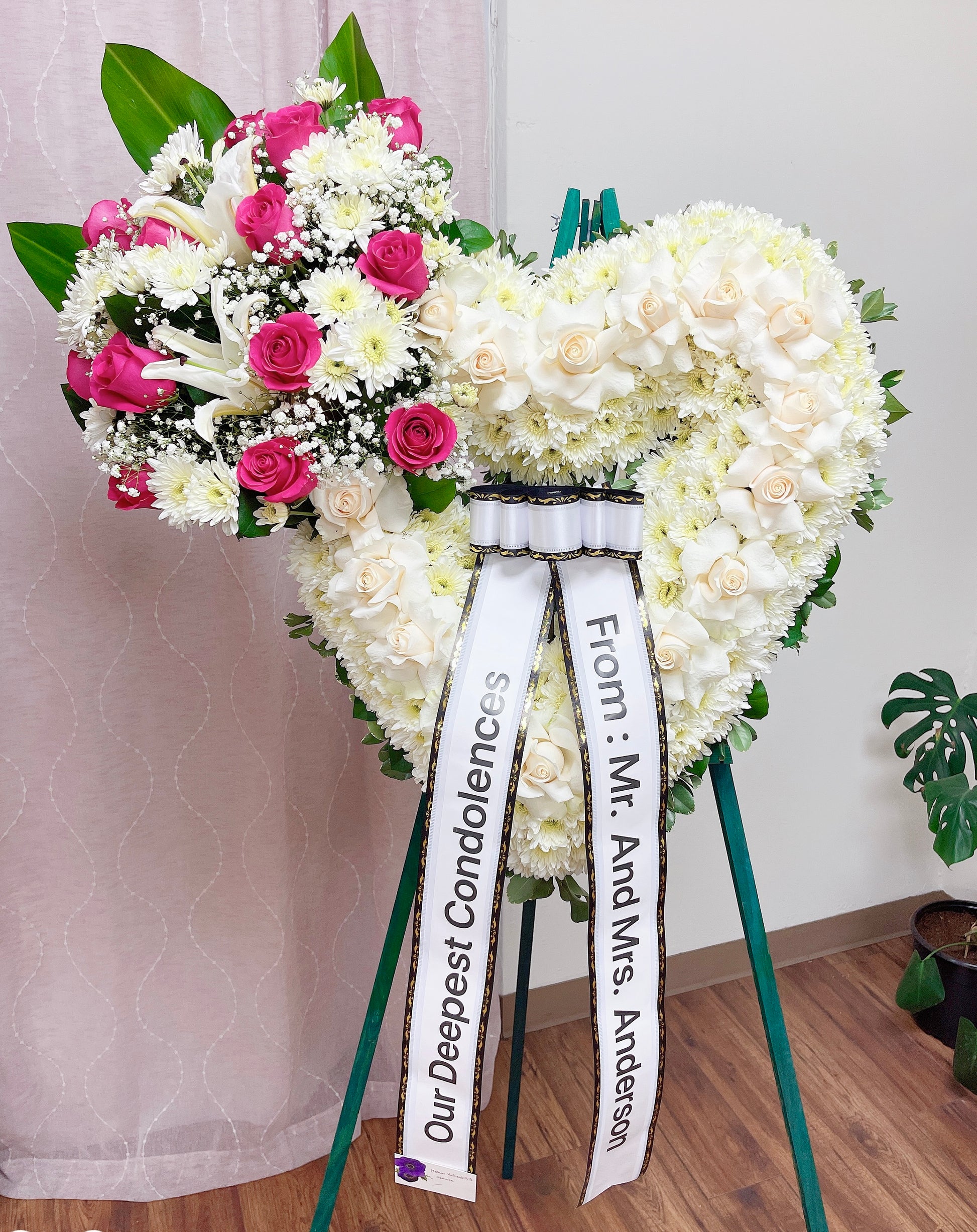 - One-sided standing heart wreath with roses (color of roses will be change to customer's choice), white lilies, white baby's breath, white cushion pom-poms and assorted greenery