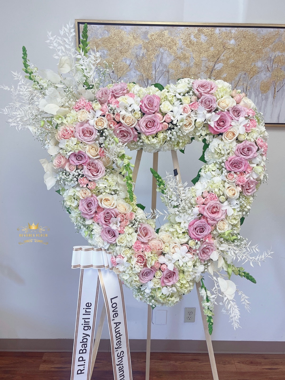 - One-sided standing heart wreath with roses (color of roses will be change to customer's choice), white lilies, white baby's breath, white cushion pom-poms and assorted greenery