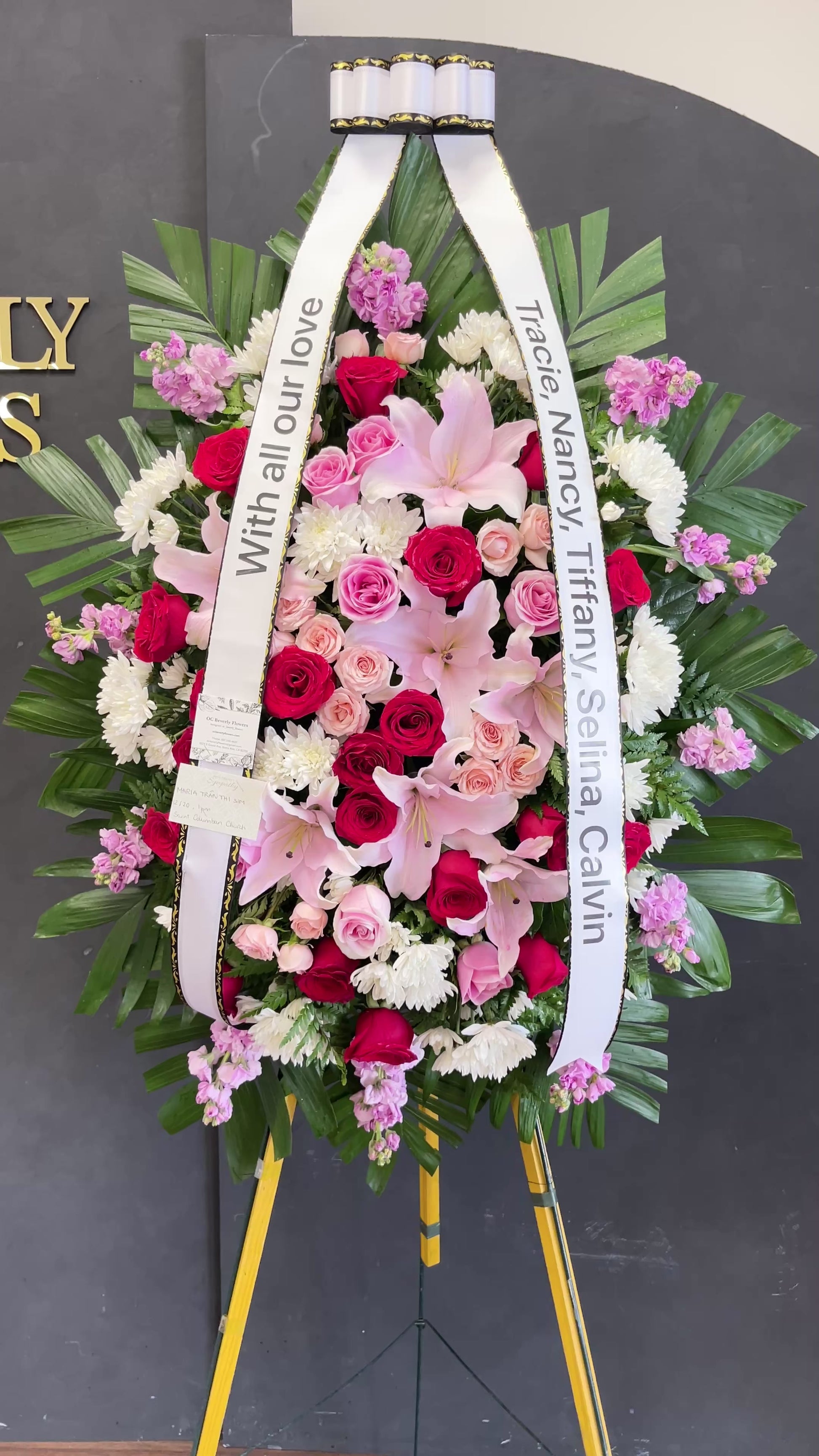 Celebrate a beautiful life with a truly heartfelt gesture. Our elegant standing sympathy spray is arranged with a gathering of radiant pink and pure white, and Red blooms. A traditional floral display for the services, it’s a touching way to honor the memory of a loved one while expressing your deepest condolences.