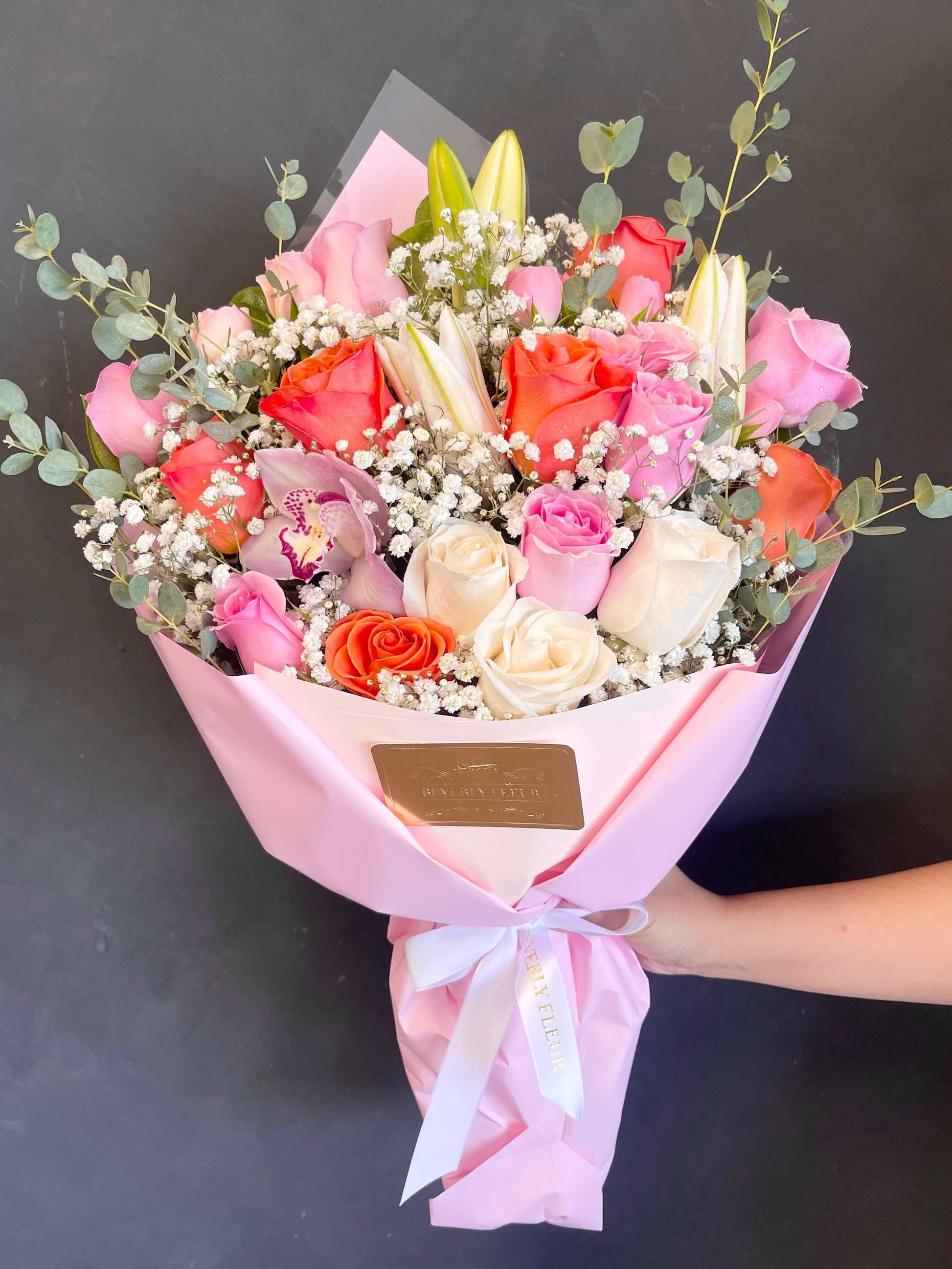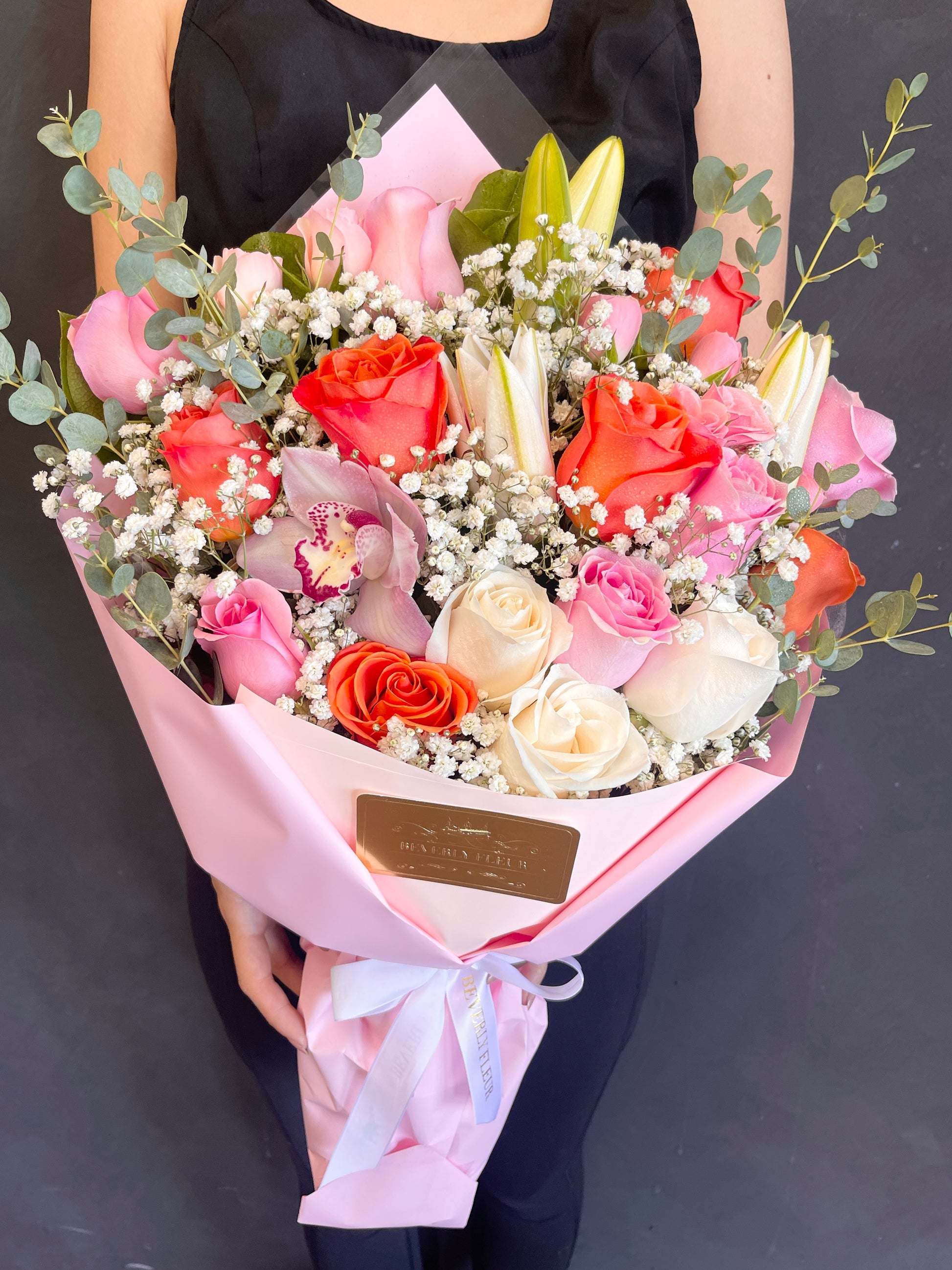 - Fresh flowers gift-wrap bouquet( lilies may come in bud form and will fully open in a few days). Waterproof wrapping finish, no container