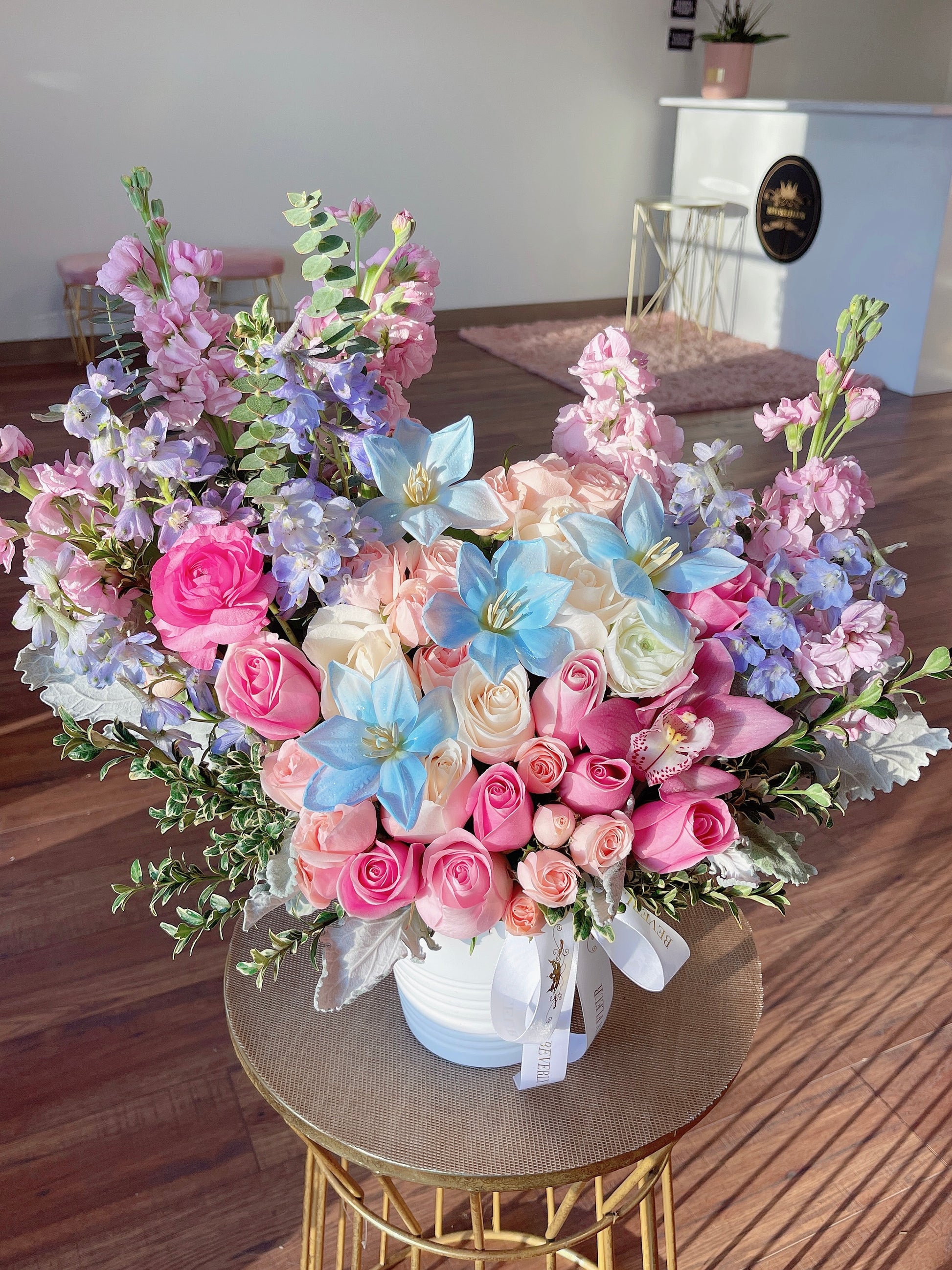 Although the actual flower arrangements may not precisely match the picture, its overall essence will. Occasionally, substitutions of flowers or containers happen due to weather, seasonality and market conditions which may affect availability. In this case, we will ensure that the style, theme and color scheme of your arrangement is preserved and will only substitute flowers of equal or higher value.