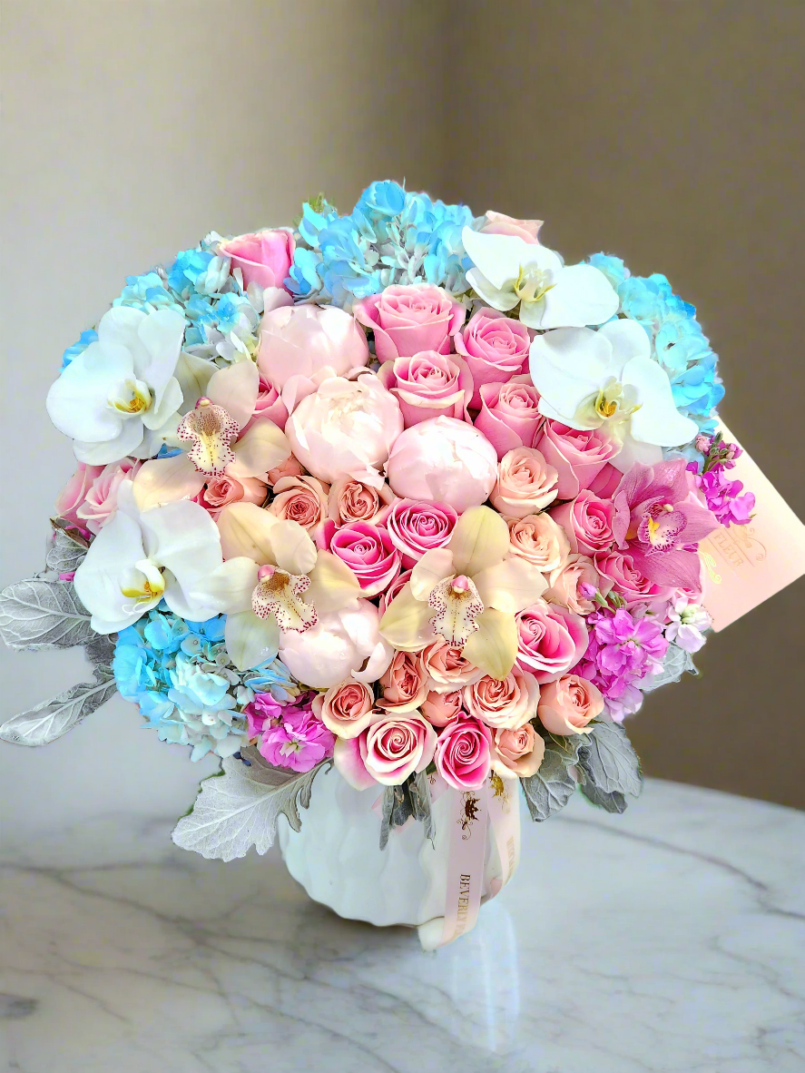 Although the actual flower arrangements may not precisely match the picture, its overall essence will. Occasionally, substitutions of flowers or containers happen due to weather, seasonality and market conditions which may affect availability. In this case, we will ensure that the style, theme and color scheme of your arrangement is preserved and will only substitute flowers of equal or higher value.