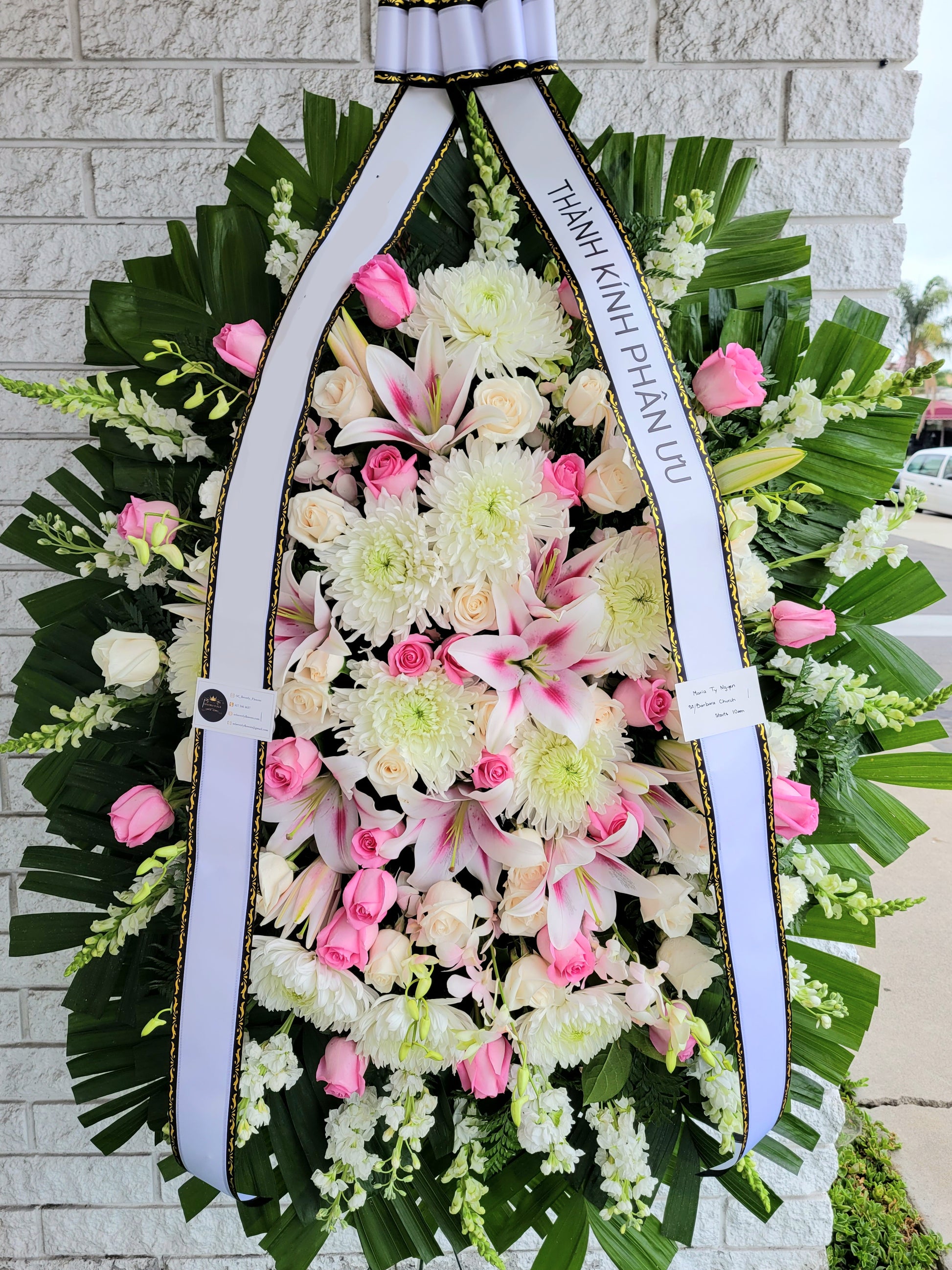 Celebrate a beautiful life with a truly heartfelt gesture. Our elegant standing sympathy spray is arranged with roses, lilies, China-mum, orchid, snap dragon and carnation. A traditional floral display for the services, it’s a touching way to honor the memory of a loved one while expressing your deepest condolences.