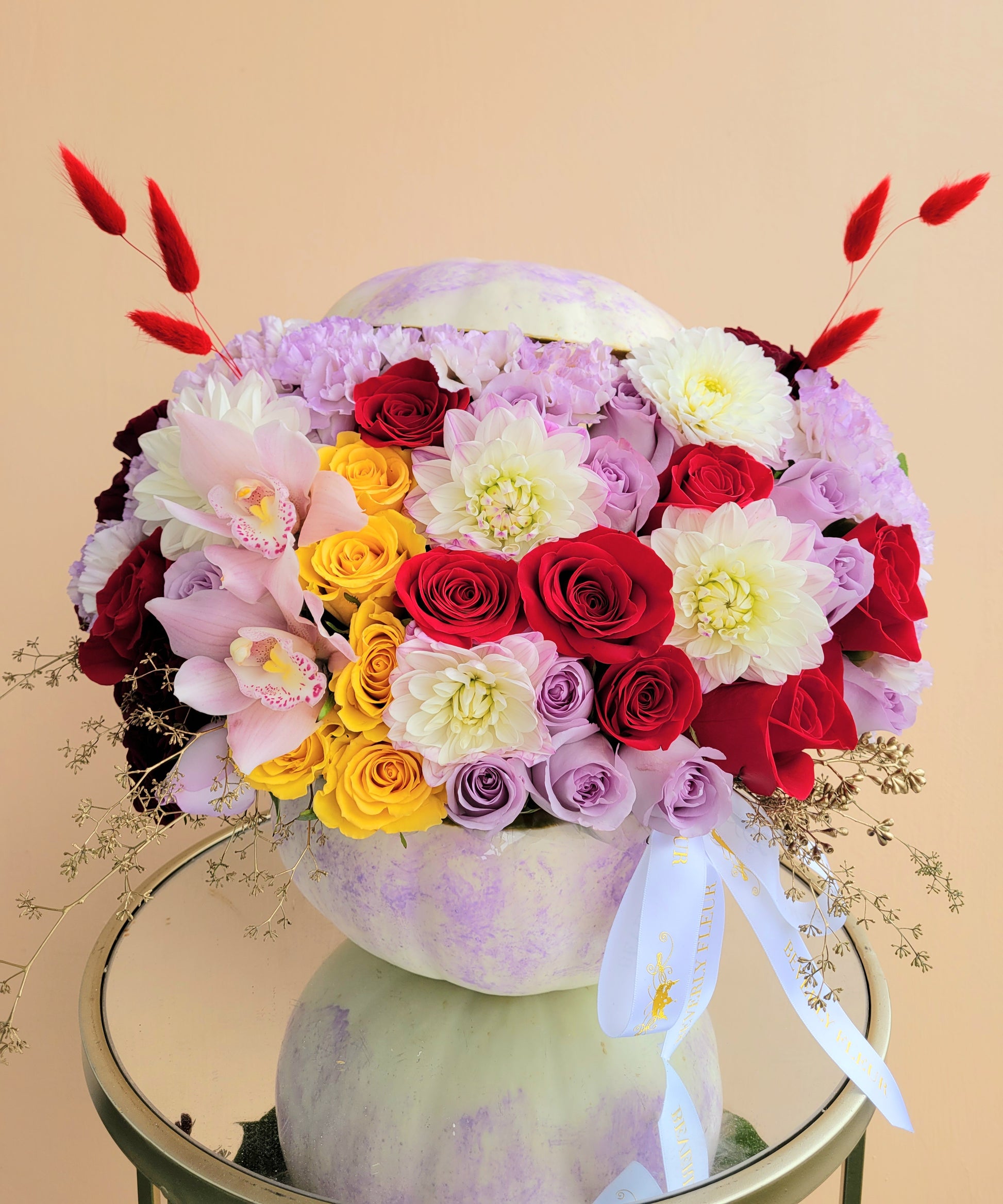In some cases, the pictures may represent an overall color scheme, shape or look and include a one-of-a-kind vase or wrapping paper which cannot be exactly replicated.