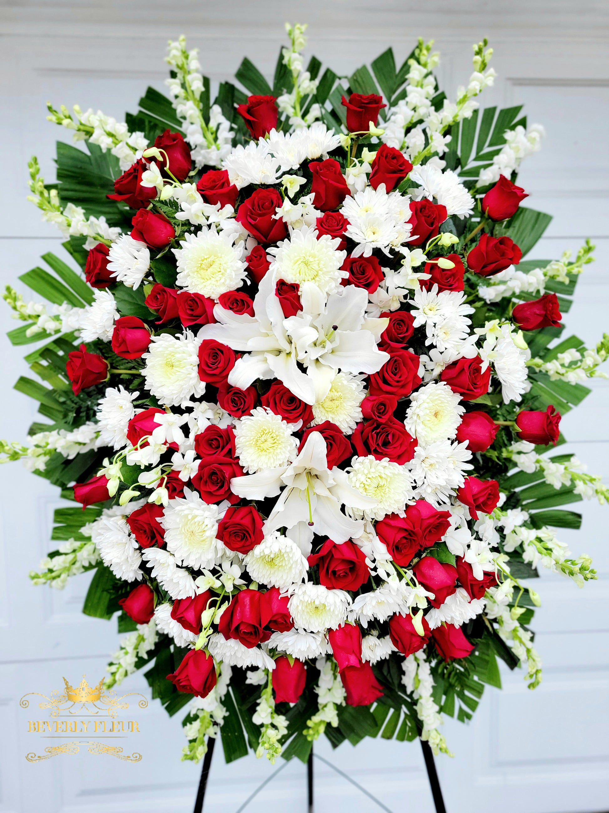 Celebrate a beautiful life with a truly heartfelt gesture. Our elegant standing sympathy spray is arranged with roses, lilies, China-mum, orchid, snap dragon and carnation. A traditional floral display for the services, it’s a touching way to honor the memory of a loved one while expressing your deepest condolences.