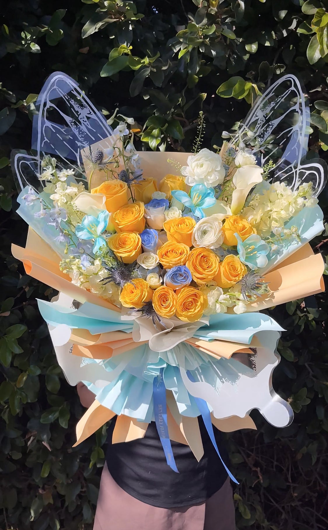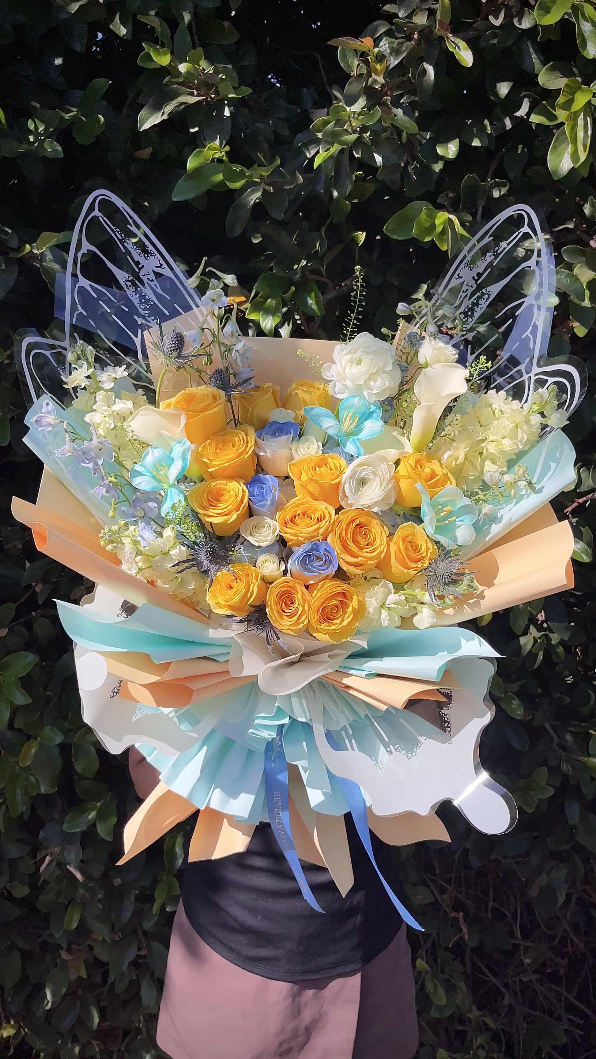 - Fresh flowers gift-wrap bouquet. Paper wrapping finish. This bouquet has its own Water Source no need for extra container .