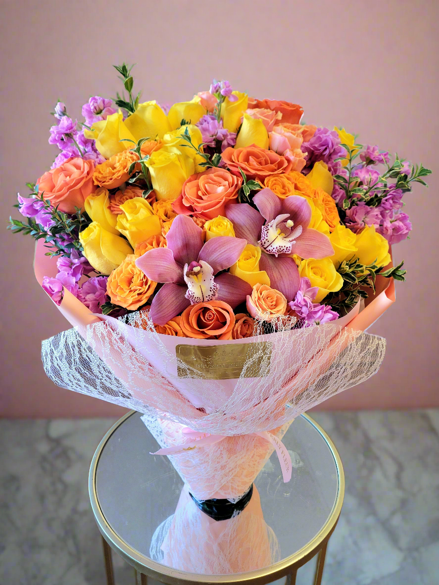 These fresh flowers are arranged in a vase and wrapped with Beverly Fleur deluxe wrapping to enhance its aesthetic look. Send this arrangement to your loved ones and they'll be transfixed by this dazzling display of blooms.