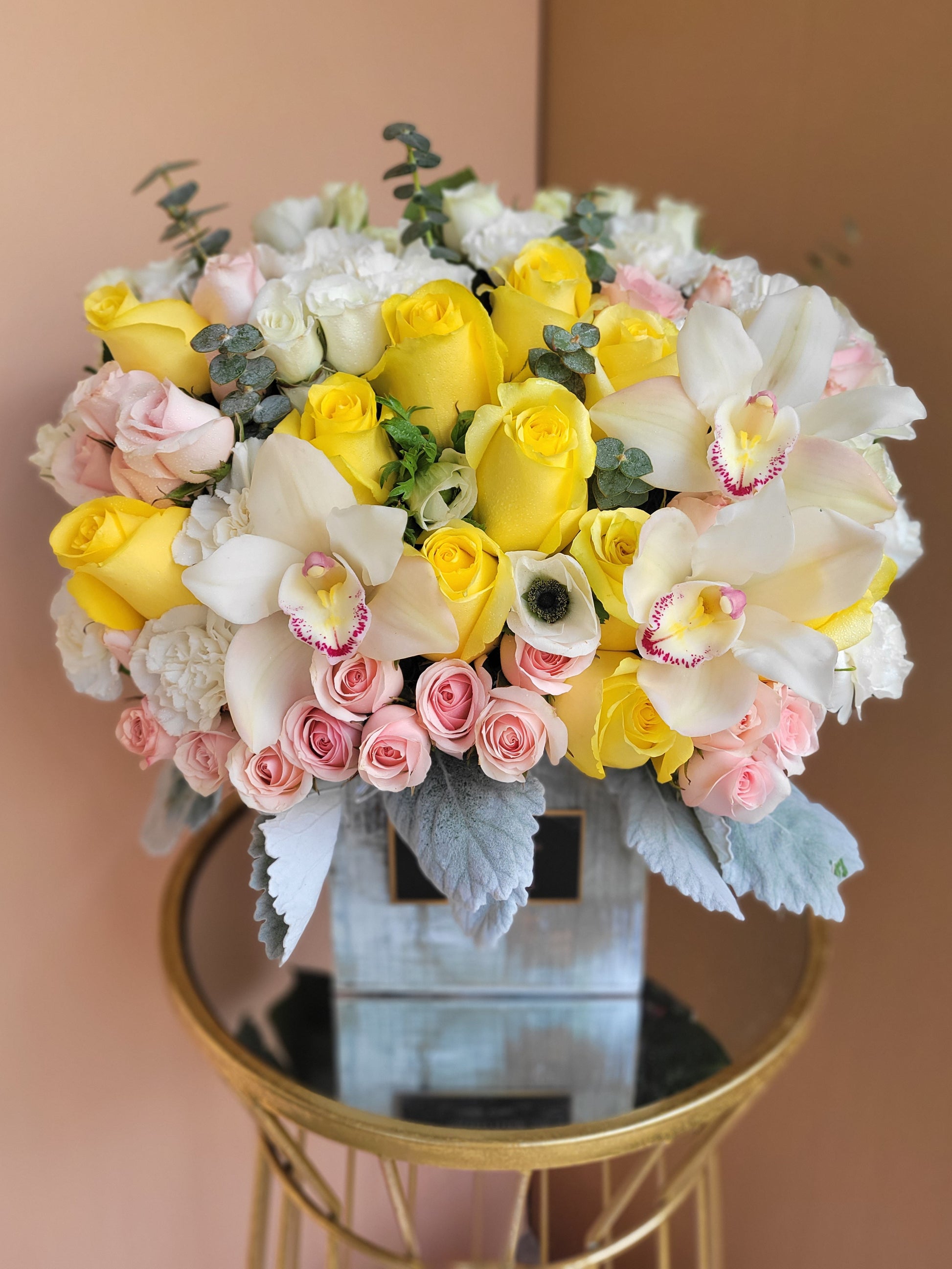 Although the actual flower arrangements may not precisely match the picture, its overall essence will. Occasionally, substitutions of flowers or containers happen due to weather, seasonality and market conditions which may affect availability. In this case, we will ensure that the style, theme and color scheme of your arrangement is preserved and will only substitute flowers of equal or higher value.