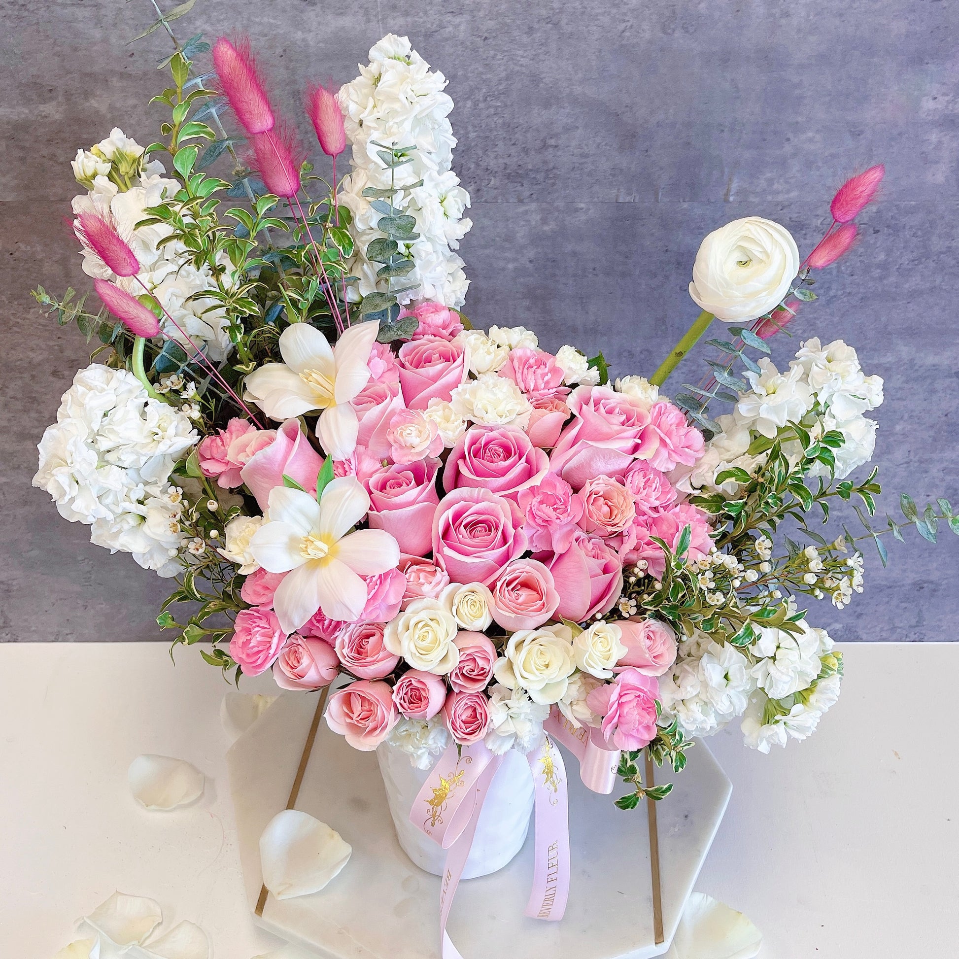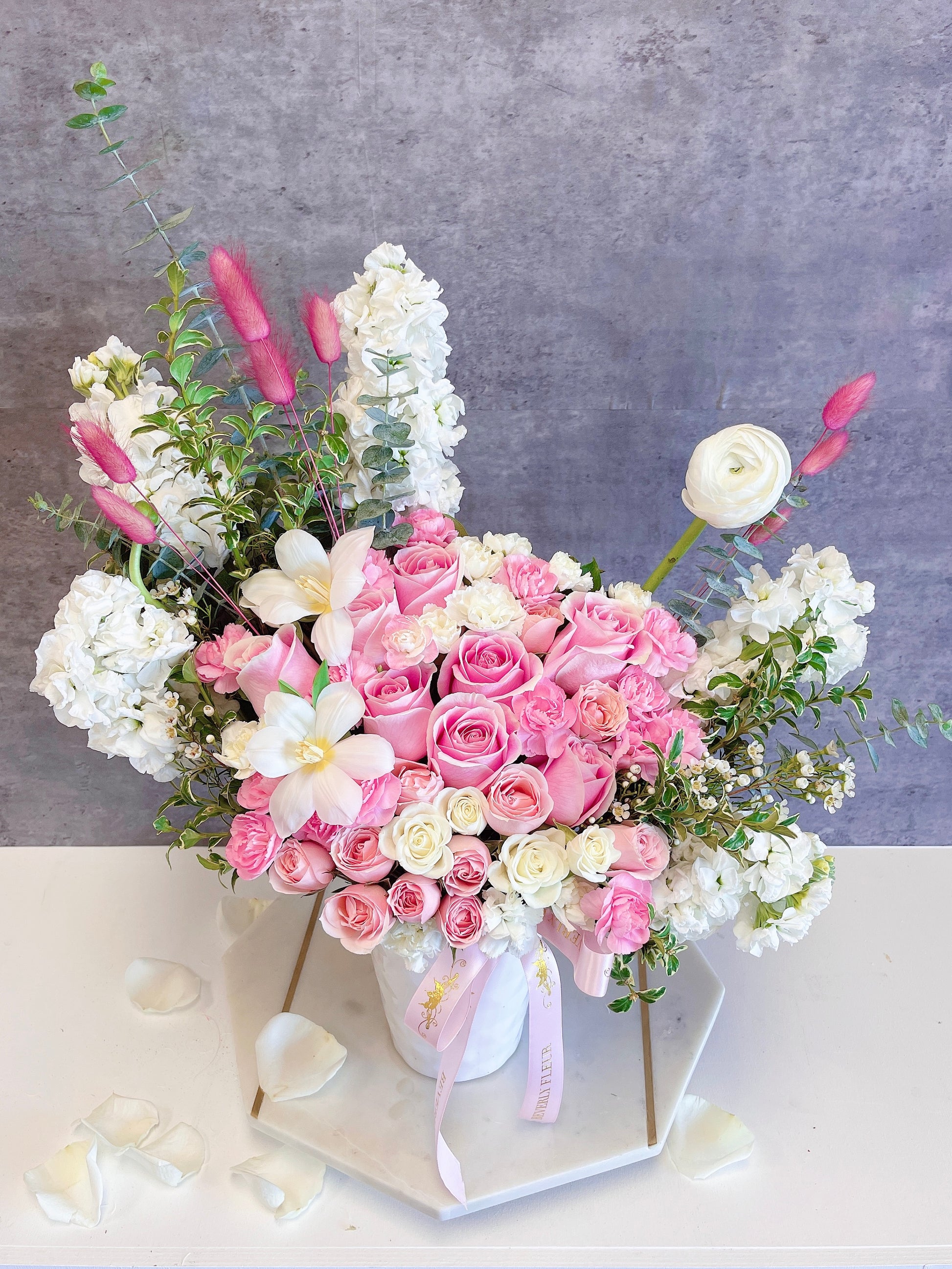 Although the actual flower arrangements may not precisely match the picture, its overall essence will. Occasionally, substitutions of flowers or containers happen due to weather, seasonality and market conditions which may affect availability. In this case, we will ensure that the style, theme and color scheme of your arrangement is preserved and will only substitute flowers of equal or higher value.