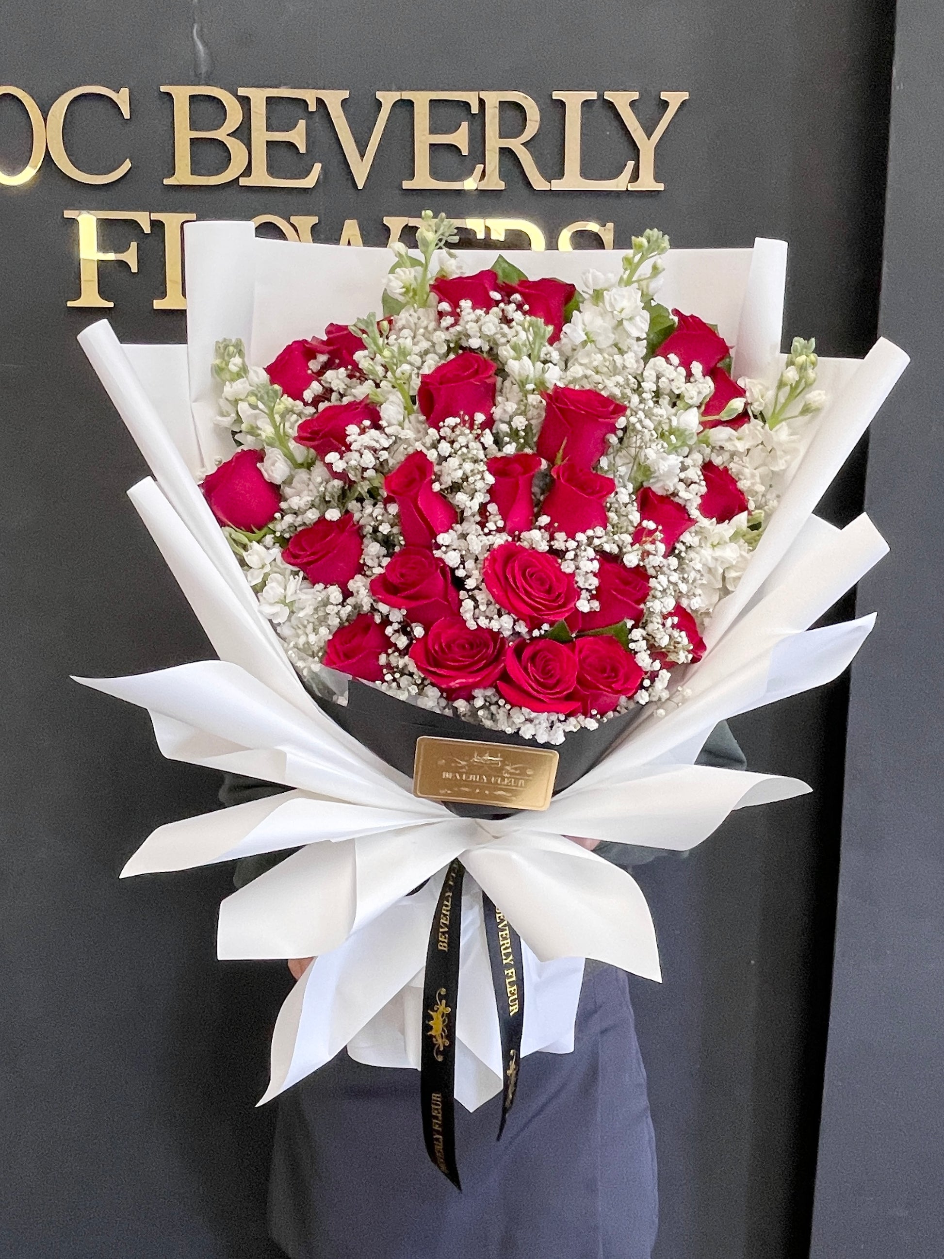 - Fresh red roses ( 2 dozens) gift-wrap bouquet. Waterproof wrapping finish, no container