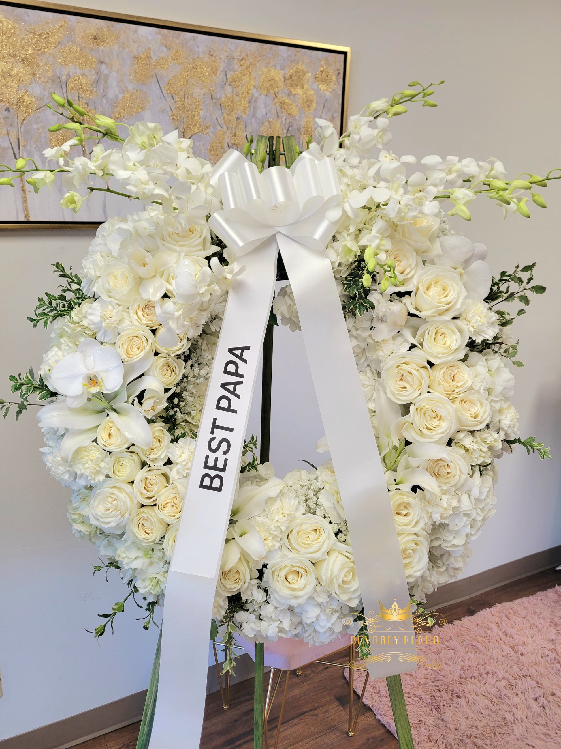 - One-sided standing wreath with roses (color of roses will be change to customer's choice), white lilies, white baby's breath, white cushion pom-poms and assorted greenery